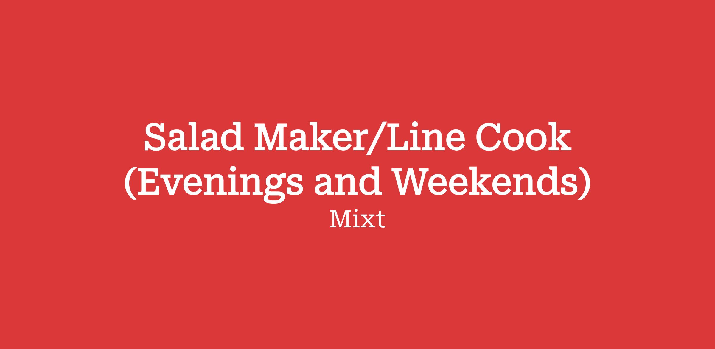 DescriptionJoin the growing MIXT family! We’re seeking passionate Salad Makers to join our growing team! If you love connecting over delicious food, delivering standout guest experiences, and thriving in a fast-paced restaurant environment, you’ll fit right into our food-loving, people-first culture.